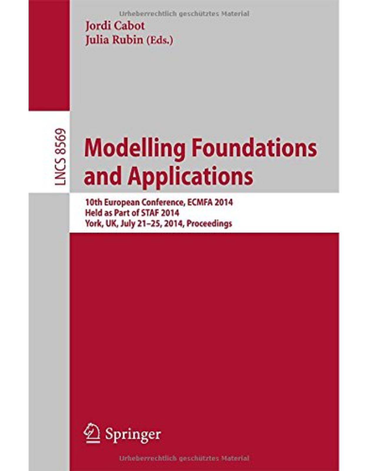 This book constitutes the proceedings of the 10th European Conference on Modelling Foundations and Applications, ECMFA 2014, held as part of STAF 2014, in York, UK, in July 2014. The 14 foundation track papers and the 3 applications track papers presented in this volume were carefully reviewed and selected from 58 submissions. They are on all aspects of MDE, including topics such as model provenance; model transformations and code generation; model synthesis; model-driven testing; formal modeling approaches; business modeling; and usability of models.